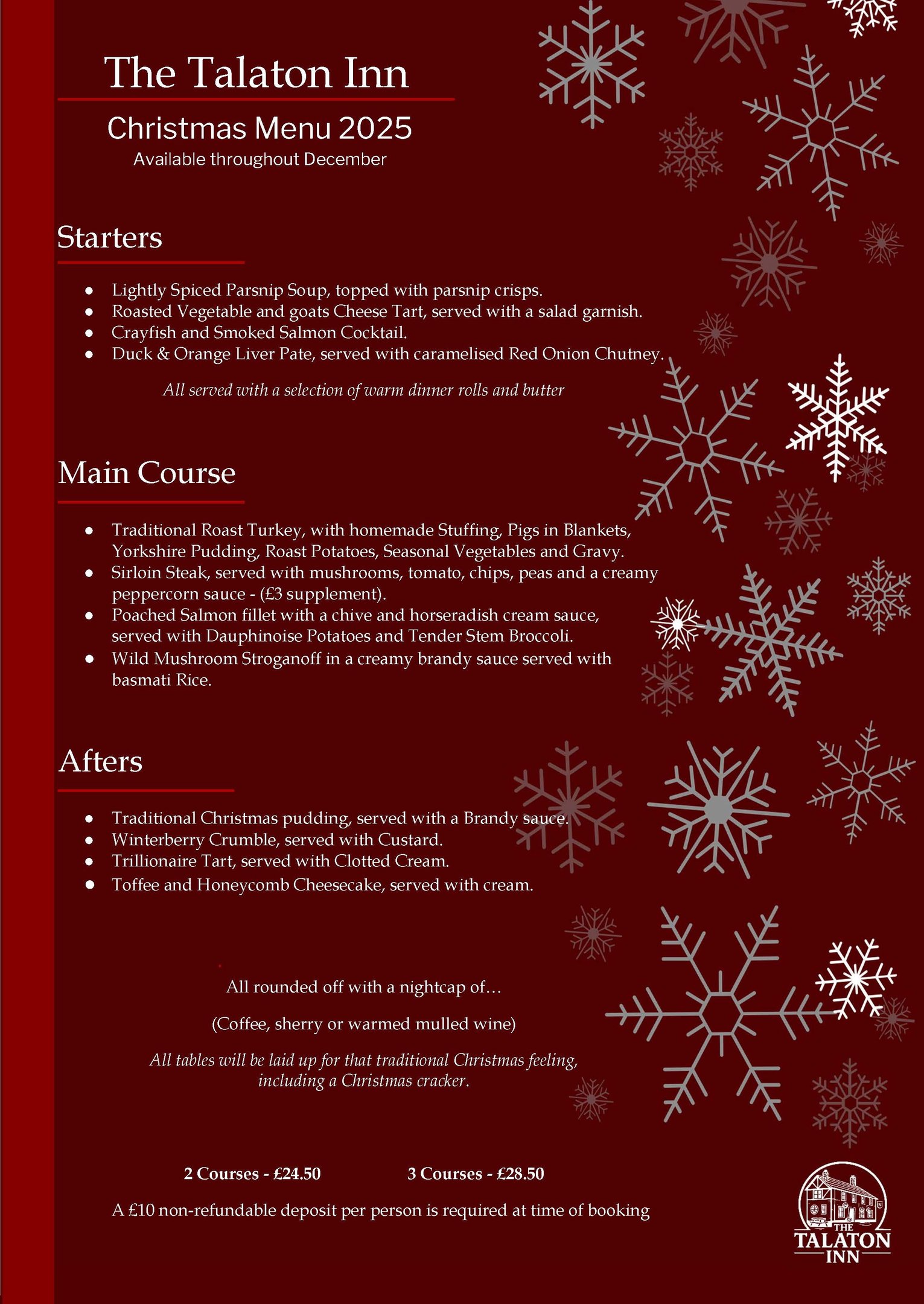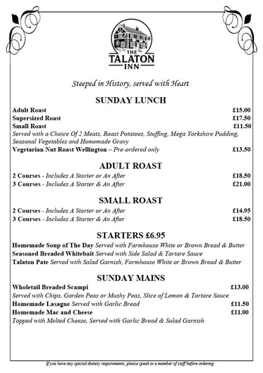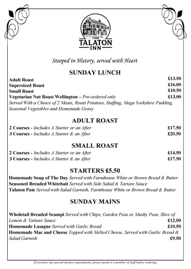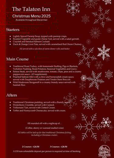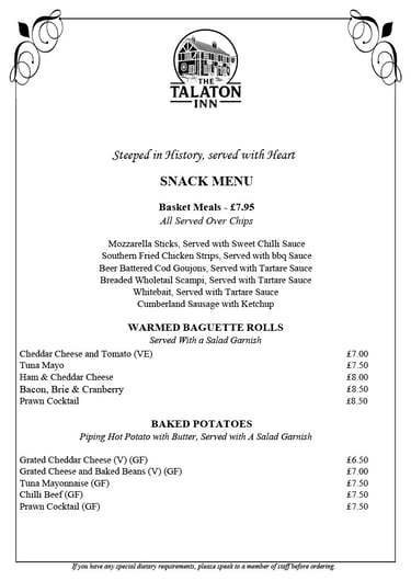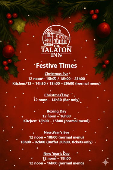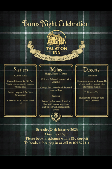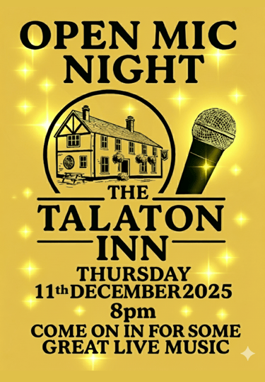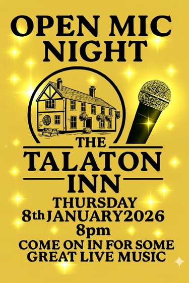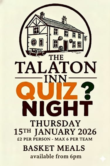 The Talaton Inn has been a cherished gathering place for locals, steeped in history and tradition, since its mention in the Domesday Book. Angie and John took over in early July 2025 and will continue to offer the local community a warm, friendly local village pub with great beverages, awesome food and entertainment the whole year round.