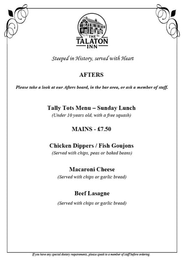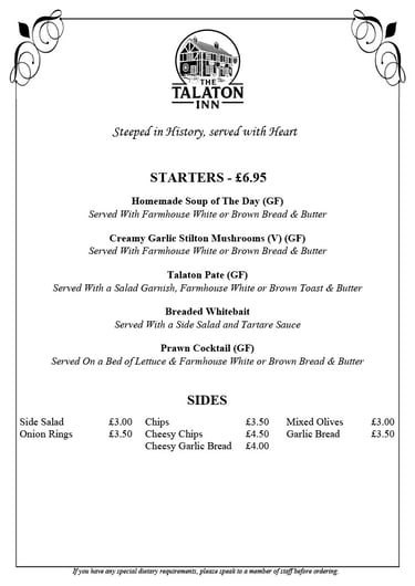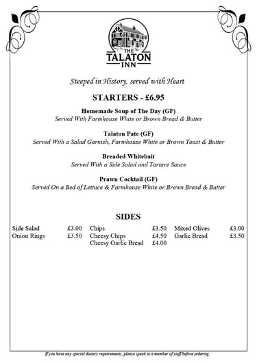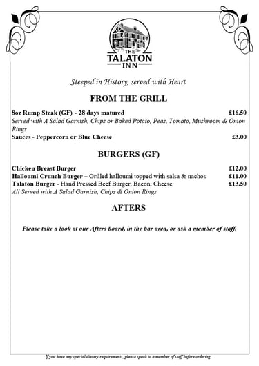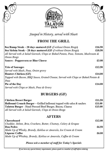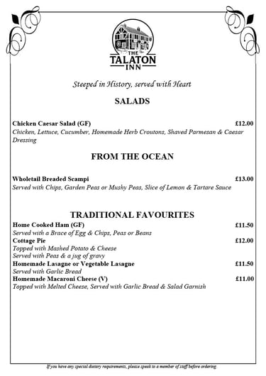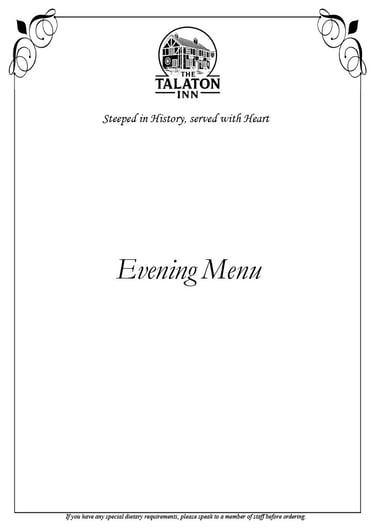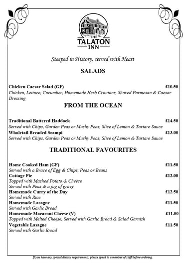 Savor our popular food offerings, crafted with care in a welcoming atmosphere at The Talaton Inn.